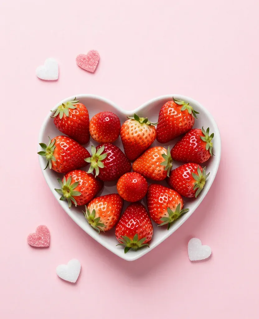 A heart-shaped bowl filled with glossy, juicy strawberries, arranged on a soft, diffused light creates subtle highlights, emphasizing the vibrant red color against a clean pink background. The symmetrical composition with hearts around the bowl adds a balanced and romantic aesthetic.