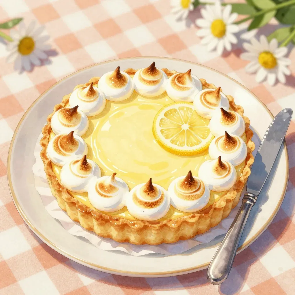 A golden lemon tart with glossy lemon curd and toasted meringue sits on a plate, centered with a lemon slice, under soft, diffused sunlight that highlights the glossy curd and toasted meringue, creating a warm and inviting atmosphere. The tart is framed by a pink and white checkered tablecloth with delicate daisies, providing a rustic and cheerful backdrop.