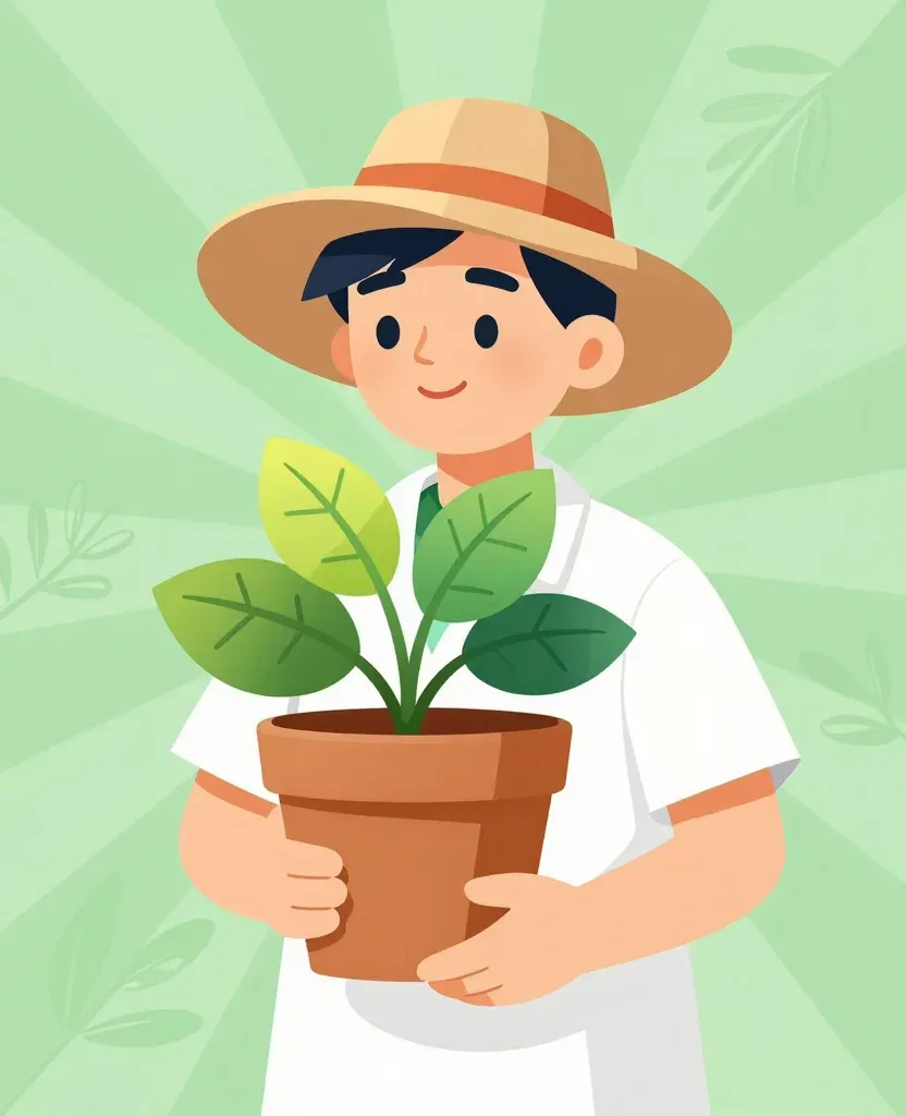 A botanist, wearing a wide-brimmed hat, holds a terracotta pot filled with glossy green leaves. Soft, diffused light highlights the texture of the pot and the vibrant leaves, creating a balanced and harmonious composition against a gradient green background with subtle leaf patterns.