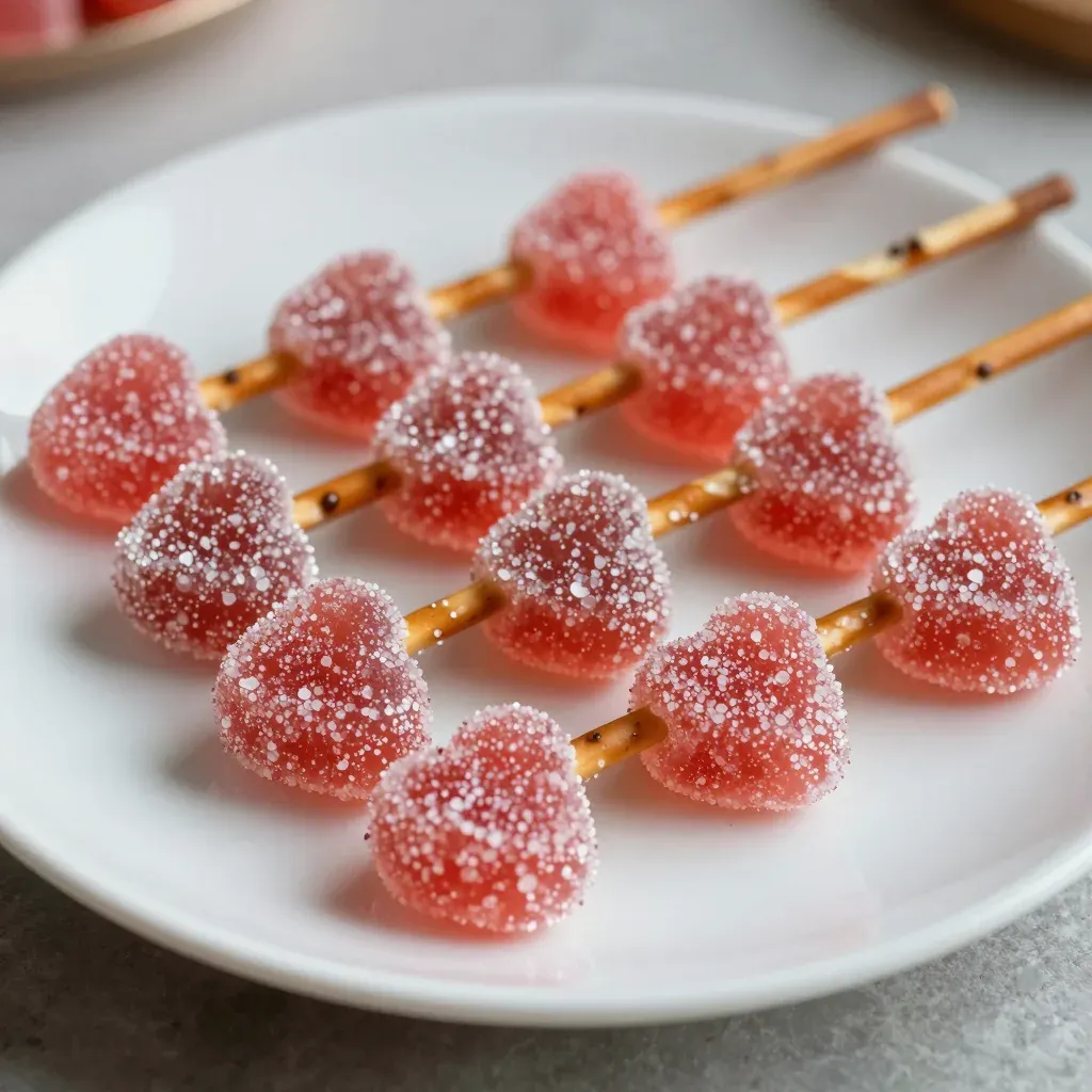 Translucent coral pink gummy candies with sparkling sugar coating are skewered on golden-brown pretzel rods, arranged diagonally on a white plate. Soft overhead natural light enhances the glossy texture and crystalline sugar, with shallow depth of field and a neutral grey background providing clean, distraction-free framing.