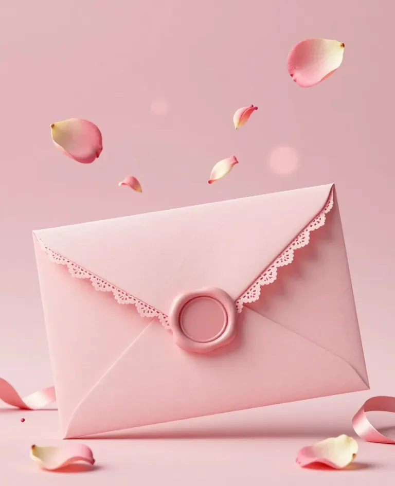 A soft, glossy pink envelope adorned with delicate lace trim and a smooth wax seal, surrounded by floating rose petals, bathed in diffused, warm pink light that highlights the textures and creates a romantic, intimate atmosphere. The blurred pink background enhances the focus on the envelope and petals, offering ample copy space for text or design elements.