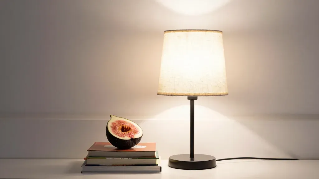 A halved fig and stack of books are arranged with a lamp, creating a warm, diffused light that highlights the glossy fig skin and matte book pages. The composition is centered, with copy space for text, making it ideal for product or interior design displays.