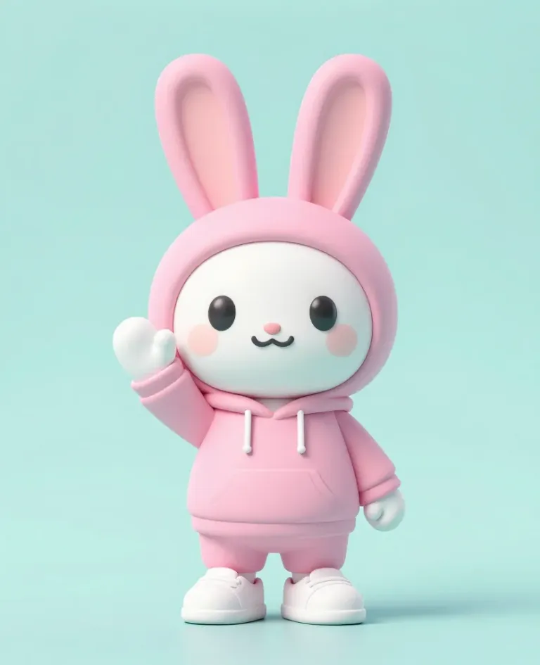 A cute, stylized bunny mascot in a soft pink hoodie waves with one paw, featuring a plush-like texture and glossy white sneakers. The image uses soft front-top lighting with a shallow depth of field, isolating the subject against a clean, uniform mint green background.