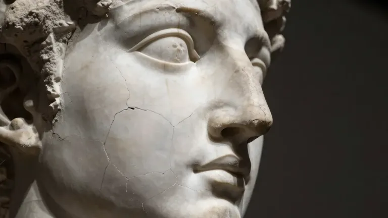 A close-up of a marble statue in profile, showcasing its rough, uneven texture and cracked surface. Directional lighting highlights the intricate details and creates dramatic shadows, emphasizing the texture and depth of the sculpture against a dark, neutral background.