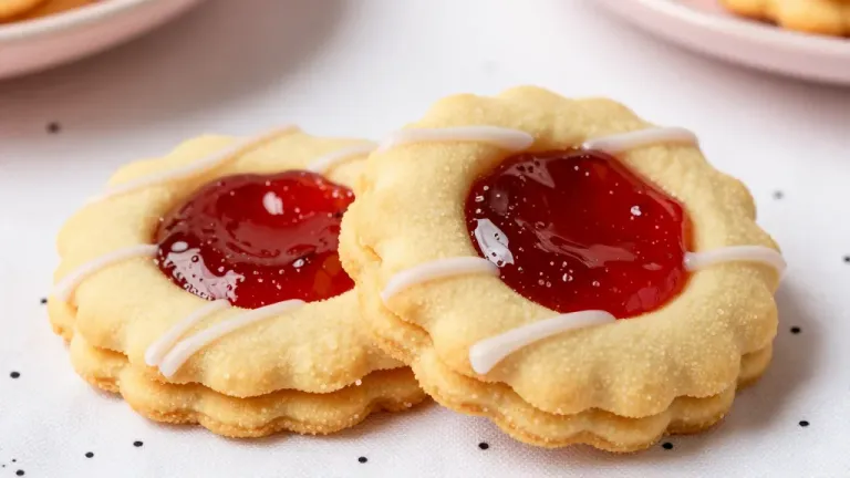 Two golden-brown thumbprint cookies feature glossy crimson cherry jam centers and delicate white icing drizzle, with crisp fluted edges. Soft overhead lighting creates gentle highlights on the jam and icing, while shallow depth of field isolates the cookies against a clean, speckled background with blurred plates in the distance.