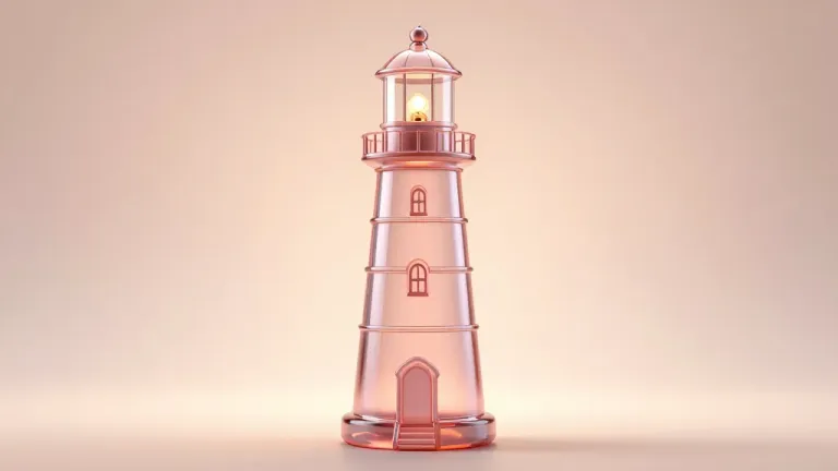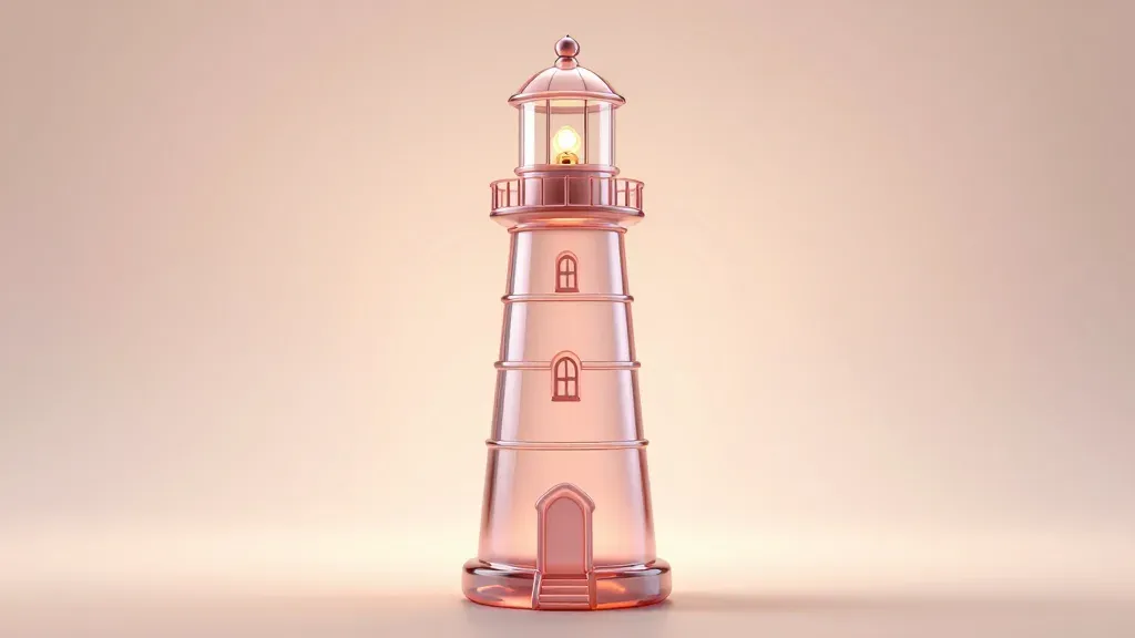 A glass lighthouse with intricate details glows softly, casting a warm, ambient light that highlights its smooth, reflective rose-gold surface. The blurred, warm beige background provides a calm and unobtrusive setting, allowing the lighthouse to stand as the focal point with ample copy space.
