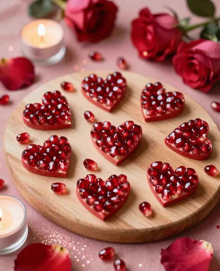 Heart-shaped pomegranate slices glisten on a wooden cutting board, surrounded by delicate red roses and scattered seeds, creating a romantic and celebratory scene. The soft, diffused lighting highlights the glossy texture of the pomegranate seeds and casts gentle shadows on the natural grain of the wood, adding depth and interest to the composition.