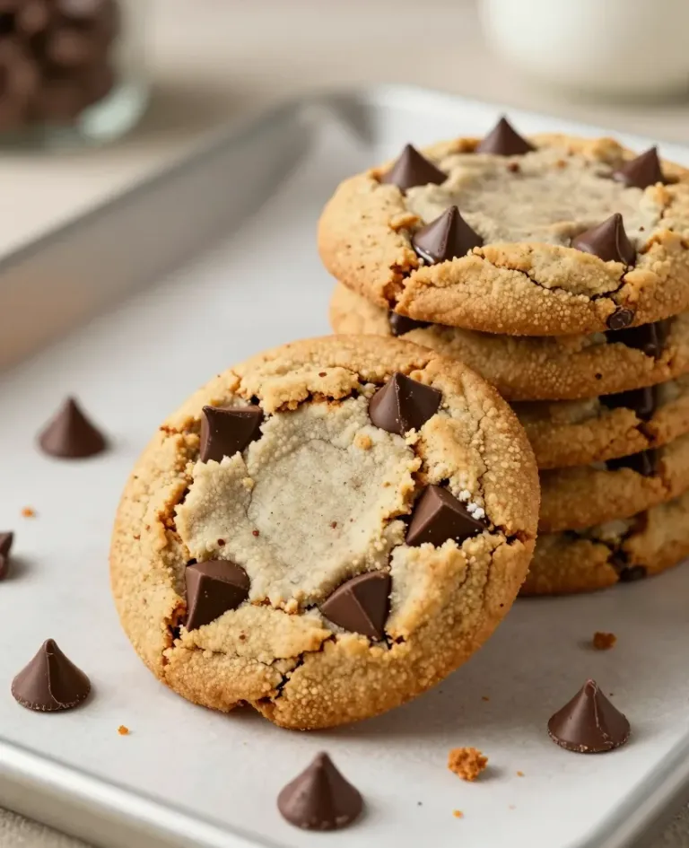 Golden-brown chocolate chip cookies are stacked and partially broken, showcasing their soft, slightly chewy texture and glossy chocolate chips. The soft, diffused lighting highlights the glossy chocolate chips and the golden-brown edges, creating a warm and inviting visual. The blurred background with scattered chocolate chips and crumbs adds depth and focus to the cookies, making it ideal for food and dessert content.