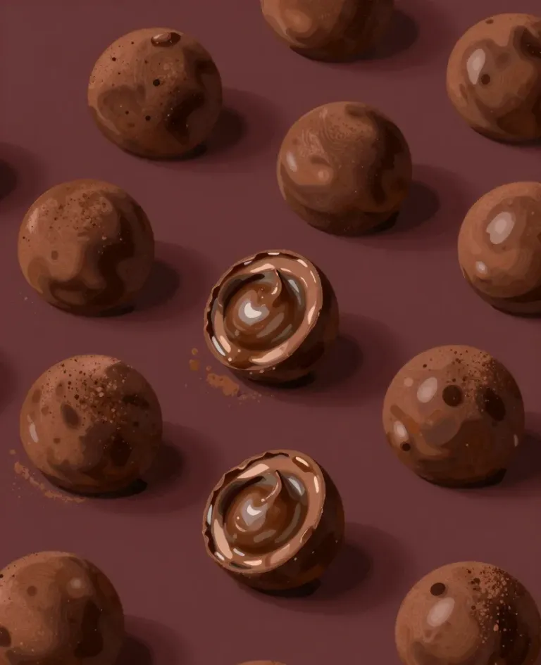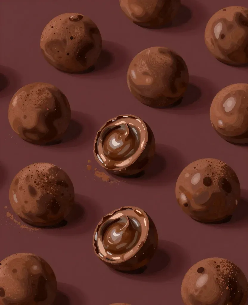 Glossy chocolate truffles scattered across a deep purple background, creating a rich contrast and soft highlights that enhance their texture. The scattered composition and blurred background add depth and visual interest.