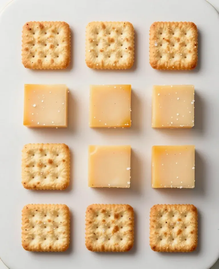 Golden-brown crackers and pale yellow cheese are neatly arranged in a grid on a clean white plate, illuminated by soft, diffused light from above, creating gentle shadows and highlights. The balanced and symmetrical composition offers ample copy space for various design applications.