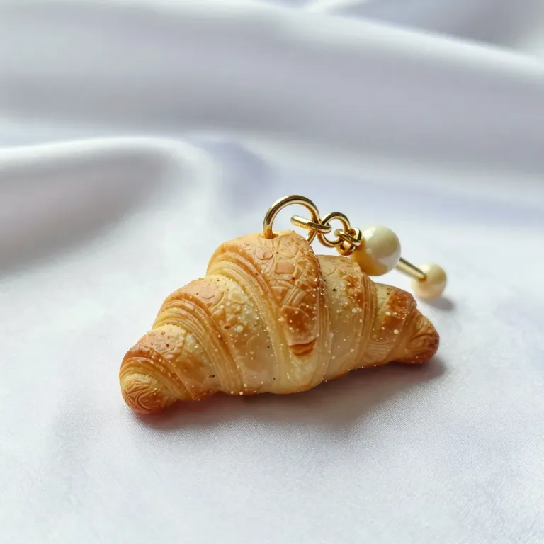 A glossy croissant bag charm with smooth pearls and a metallic clasp, highlighted by soft, diffused lighting that emphasizes the texture and luster. The shallow depth of field and soft white fabric background create a clean, elegant composition ideal for product showcases.