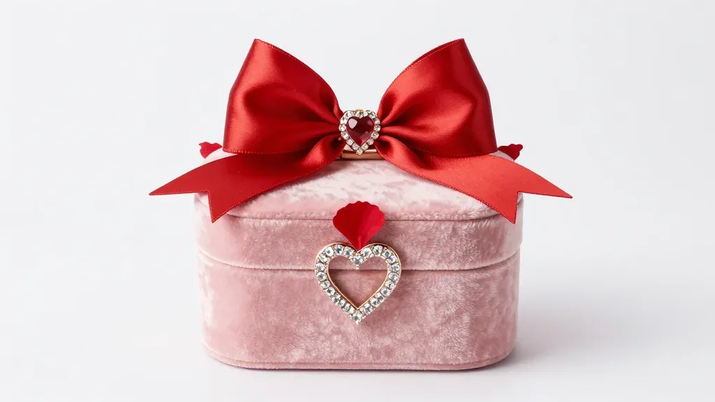 A close-up of a glossy red satin bow adorning a plush pink velvet jewelry box, softly lit to highlight the bow's sparkle and the box's texture. The clean, white background minimizes distractions, emphasizing the subject's elegance and luxury.