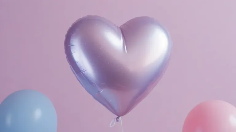 A glossy, metallic heart-shaped balloon floats against a soft, diffused light, creating highlights and reflections. The pastel pink background provides a gentle contrast, framing the metallic sheen of the balloon with other balloons below.