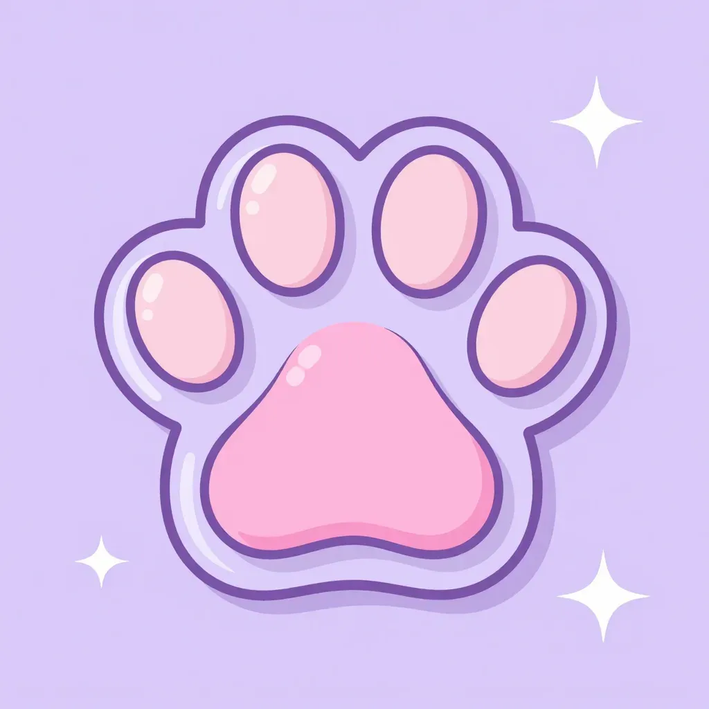 A glossy paw print with four distinct pads gleams under soft, diffused light, highlighting its smooth texture. The lavender background with subtle sparkles enhances the magical and serene atmosphere, offering ample copy space for various design applications.