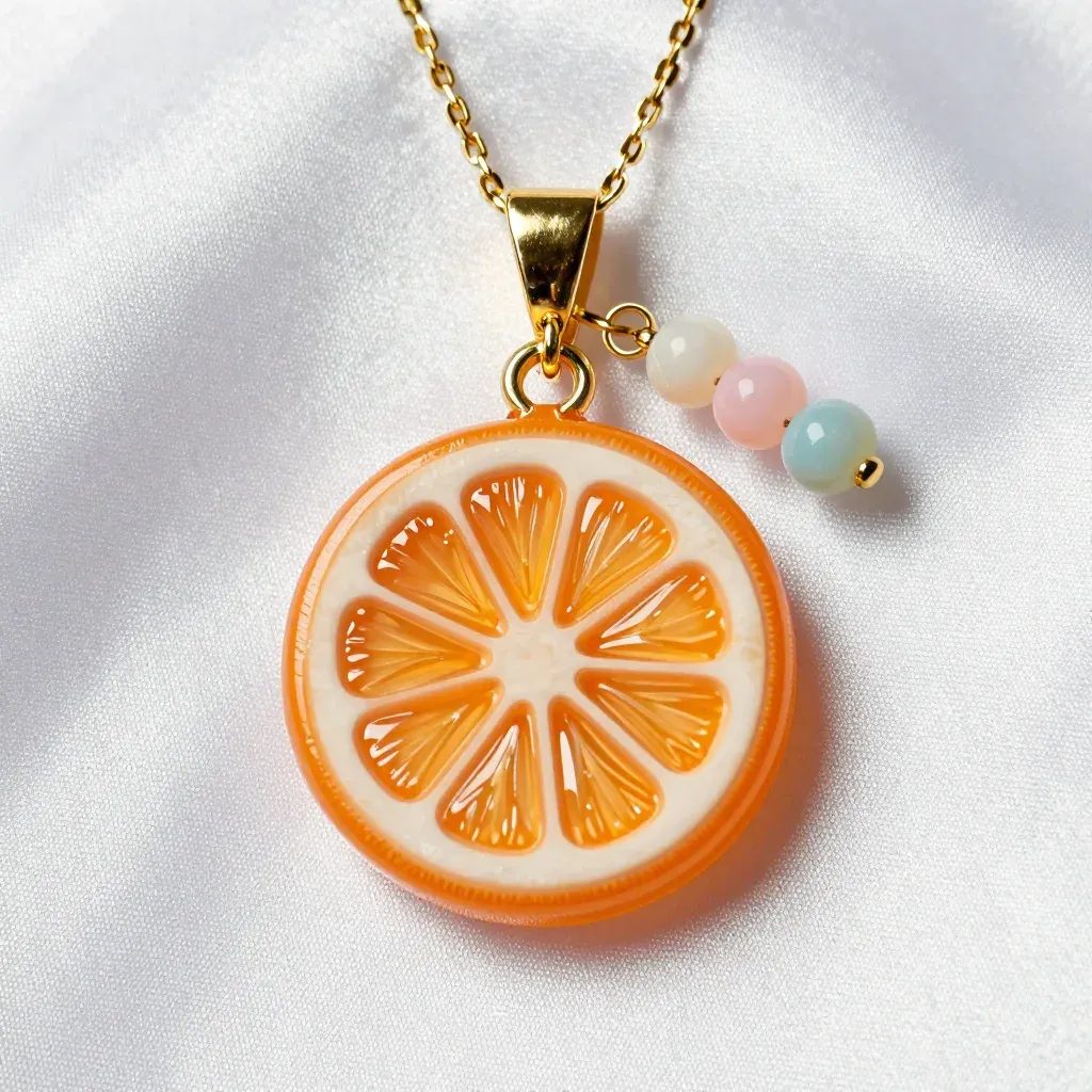 A glossy, segmented orange slice charm with pastel pink and light blue beads, highlighted by bright, direct light. The soft, white fabric background ensures the focus remains on the pendant, providing ample copy space.