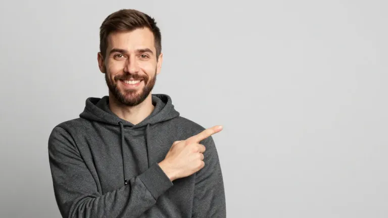 A bearded man in a charcoal gray hoodie smiles warmly while pointing to the right with his right hand, his skin showing a slight sheen under soft frontal lighting. The image features a clean, light gray background with shallow depth of field, emphasizing the subject’s face and gesture.