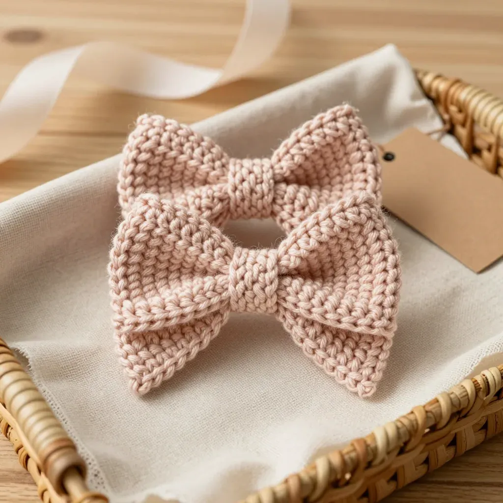 A delicate, soft pink crochet bow clip rests on a cream fabric, bathed in warm, diffused light, creating a cozy, inviting atmosphere. The shallow depth of field and centered composition highlight the intricate texture and craftsmanship of the bow, making it perfect for product photography and e-commerce displays.