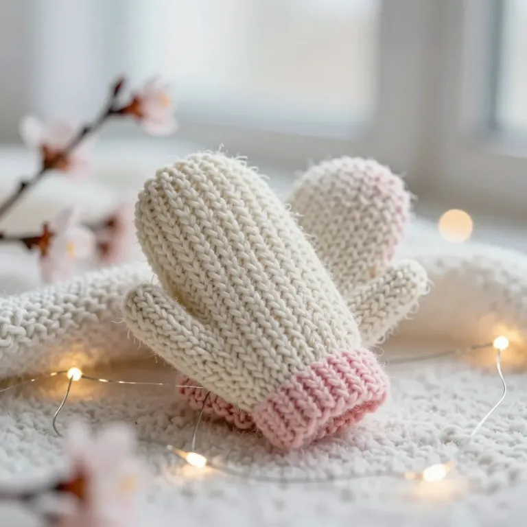 Soft, fluffy knitted mittens rest in a cozy setting illuminated by warm fairy lights, creating a serene and inviting atmosphere. The delicate pink blossoms and soft white surface enhance the tranquil ambiance, offering ample copy space for design elements.