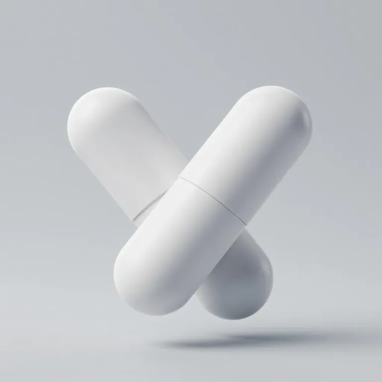 Two glossy white capsules overlap in a balanced, symmetrical composition, illuminated by soft diffused light that creates subtle shadows and highlights. The neutral gray background, blurred and out of focus, emphasizes the capsules as the main subject, providing ample copy space for design integration.