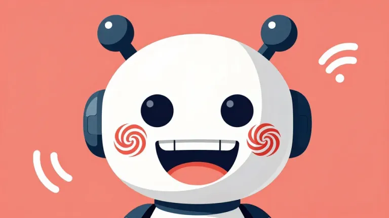A cheerful robot with a glossy white head, black antennae, and candy swirls in its cheeks beams with a wide smile, its smooth features highlighted by soft front lighting. The centered close-up composition with shallow depth of field isolates the subject against a clean coral-pink gradient background featuring subtle wireless signal icons.