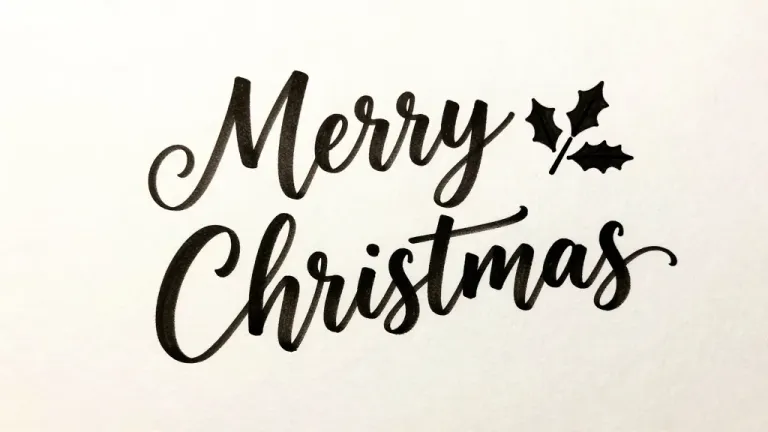 A calligraphic 'Merry Christmas' script in black ink on a smooth white paper, illuminated by diffused, soft light that enhances the depth of the lettering. The centered, balanced design with a slight curve in the text provides ample copy space for various design applications.