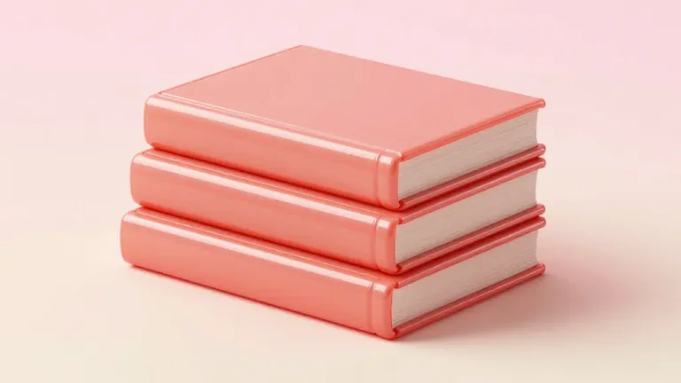 A stack of glossy, coral-pink books reflects soft, warm light, creating subtle shadows and a shallow depth of field. The off-white, blurred background ensures minimal distraction, making it ideal for product or educational content.