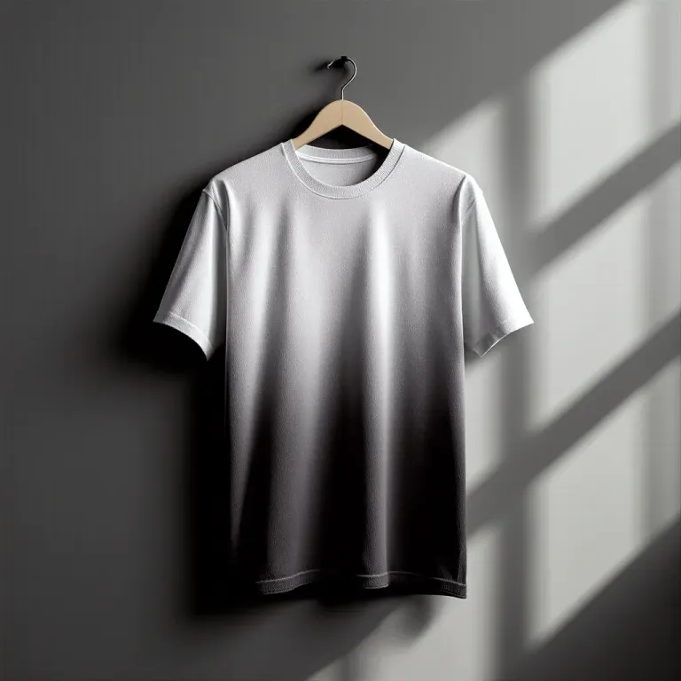 A white T-shirt hangs on a wooden hanger, showcasing a soft, slightly textured fabric with a subtle sheen. Directional, soft light highlights the shirt's texture and creates dramatic shadows against a dark, neutral wall, adding depth and interest to the composition.
