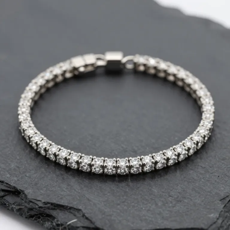 A close-up of a diamond tennis bracelet with a shiny, reflective metal and tightly packed white diamonds, softly lit to highlight the facets, set against a dark slate background that provides a striking contrast.