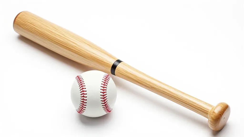 A polished wooden baseball bat and a white baseball with raised red stitching rest diagonally on a seamless off-white surface, showcasing smooth wood grain and taut leather texture. Soft high-key lighting from the upper left creates gentle highlights and shallow depth of field emphasizes the foreground subjects.