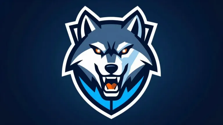 A wolf's face with sharp, angular lines and glowing orange eyes, set against a dark blue, glossy, icy texture. The directional lighting highlights the wolf's features, creating a sense of depth and emphasizing the symmetrical balance of the insignia.