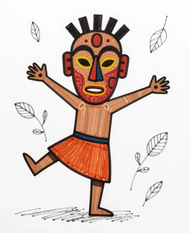 A vibrant dancer in an orange skirt and face paint, with outstretched arms and bent legs, set against a simple white background with floating leaves. Soft, diffused lighting highlights the texture of the skirt and the glossy face paint, creating a dynamic and lively composition.