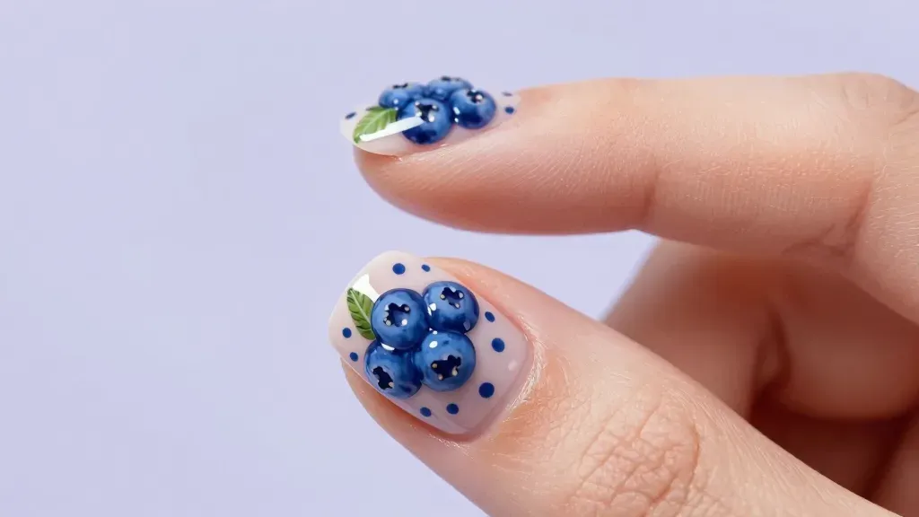 Two fingernails feature intricate blueberry nail art with a glossy, high-shine finish and textured 3D berries mimicking fruit skin. Soft diffused front lighting creates subtle highlights on the berries and nail edges, with a shallow depth of field and plain light lavender-gray background enhancing focus on the detailed design.