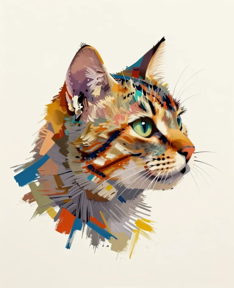 A close-up of a cat's head and shoulders, rendered with thick, layered brushstrokes in warm and cool tones, softly lit to highlight the cat's features. The neutral background slightly blurs the focus, emphasizing the cat's vibrant colors and textures.
