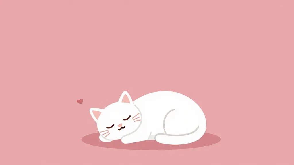 A white cartoon kitten curls into a peaceful nap with closed eyes and a tiny red heart floating near its ear, rendered in smooth, matte fur with soft gradients. The image features diffuse overhead lighting and a centered, low-angle composition against a solid dusty rose background with minimal negative space.
