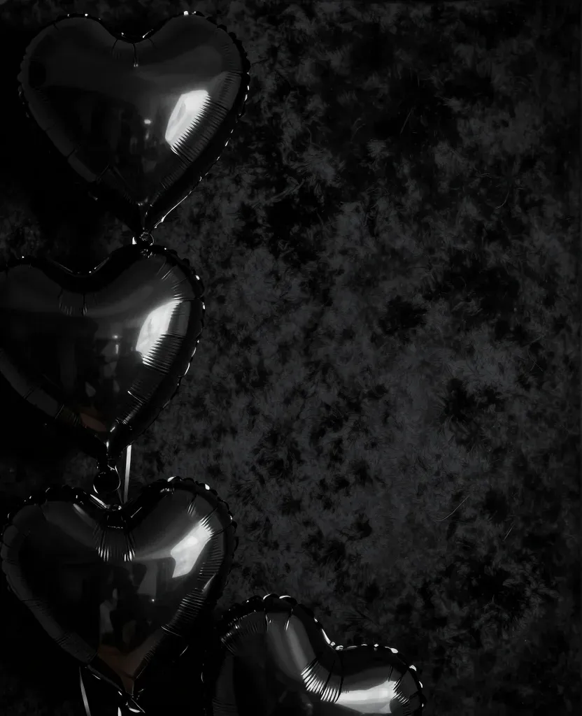 Reflective heart-shaped balloons dominate the frame, their glossy surface catching the diffused light, creating a striking contrast against the dark, textured background. The shallow depth of field isolates the balloons, emphasizing their delicate texture and the interplay of light and shadow.