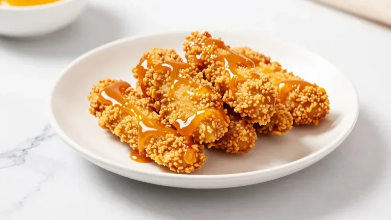 Crispy fried chicken tenders with granular breading are generously coated in a glossy, viscous caramel-colored sauce, creating a rich contrast between the rough texture and smooth glaze. Soft directional lighting from the upper left enhances depth with subtle shadows, while a shallow depth of field keeps focus on the central cluster against a clean marble surface with copy space.