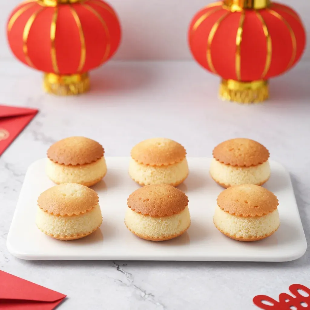 Six golden-brown sponge cakes with a glossy top and tender interior are neatly arranged on a white rectangular plate, illuminated by warm, soft light that highlights their texture and color, creating a cozy and inviting atmosphere. The red lanterns in the background add depth and context to the festive setting.