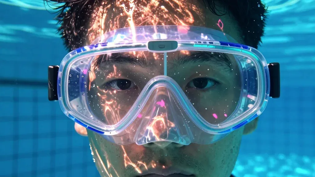 A close-up of a diver's face underwater, illuminated by golden light filtering through the water, creating shimmering highlights and reflections. The shallow depth of field blurs the background, emphasizing the diver's face and the glossy water texture.