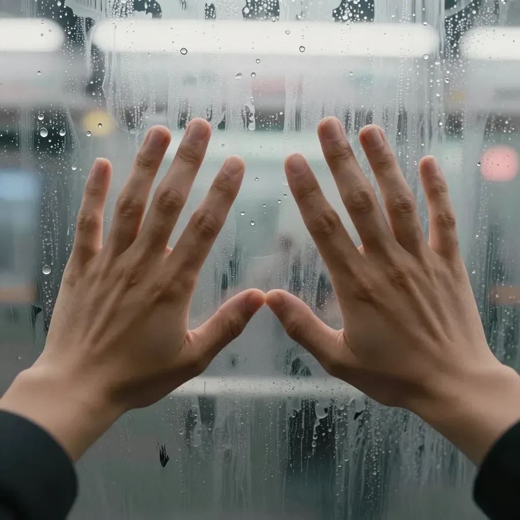Two hands form a heart shape against a misted glass window, with diffused light creating a soft glow and reflections on the glass. The blurred, out-of-focus interior background adds depth and context to the composition.