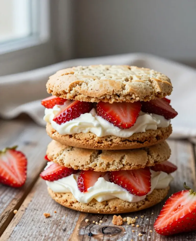 A golden-brown strawberry shortcake stack with creamy white filling and glossy red strawberry slices, bathed in soft, natural light that highlights the textures and colors, creating a shallow depth of field that keeps the focus on the dessert while softly blurring the rustic wooden surface and white cloth background.
