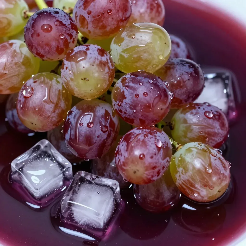 Glossy, translucent grapes with water droplets and hard, clear ice cubes are highlighted by soft, diffused light, creating a glossy sheen and emphasizing the textures. The dark, blurred background suggests a deep purple liquid, adding depth and focus to the composition.