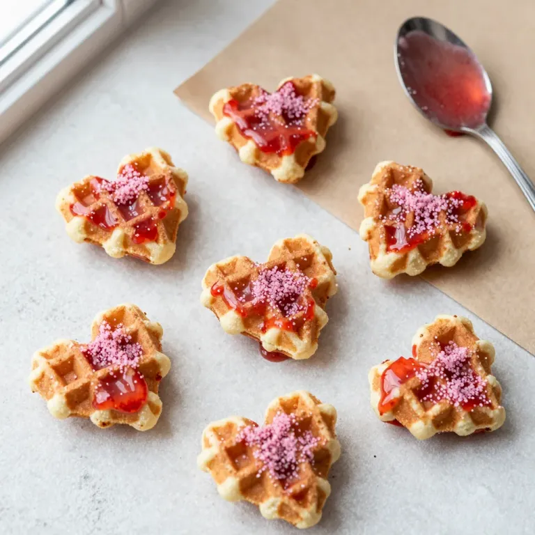 Golden-brown heart-shaped waffle bites are artfully arranged with glossy red jam and soft pink sprinkles, illuminated by soft natural light that highlights their textures and glossy sheen. The light gray background subtly frames the waffles, creating a clean and elegant presentation.