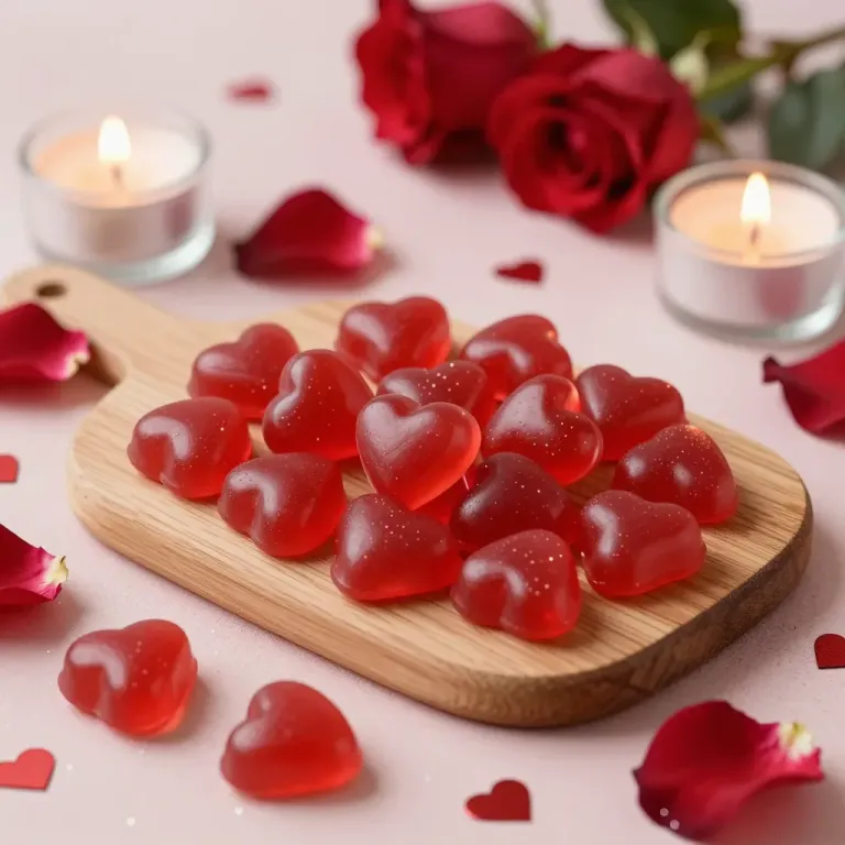 Translucent red gummy candies with a glossy, gelatinous texture are arranged on a wooden board, surrounded by scattered rose petals and lit candles, evoking a romantic ambiance. Soft warm lighting from candles creates gentle highlights and shadows, with a shallow depth of field blurring the background to emphasize the central composition.
