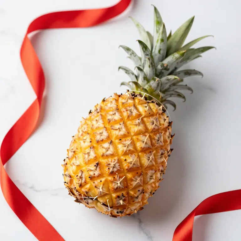 A golden pineapple with sharp triangular scales is centered against a clean white background, complemented by a vibrant red ribbon. The soft, diffused lighting highlights the glossy texture and creates gentle shadows, emphasizing the fruit's natural beauty and the dynamic contrast with the red ribbon.