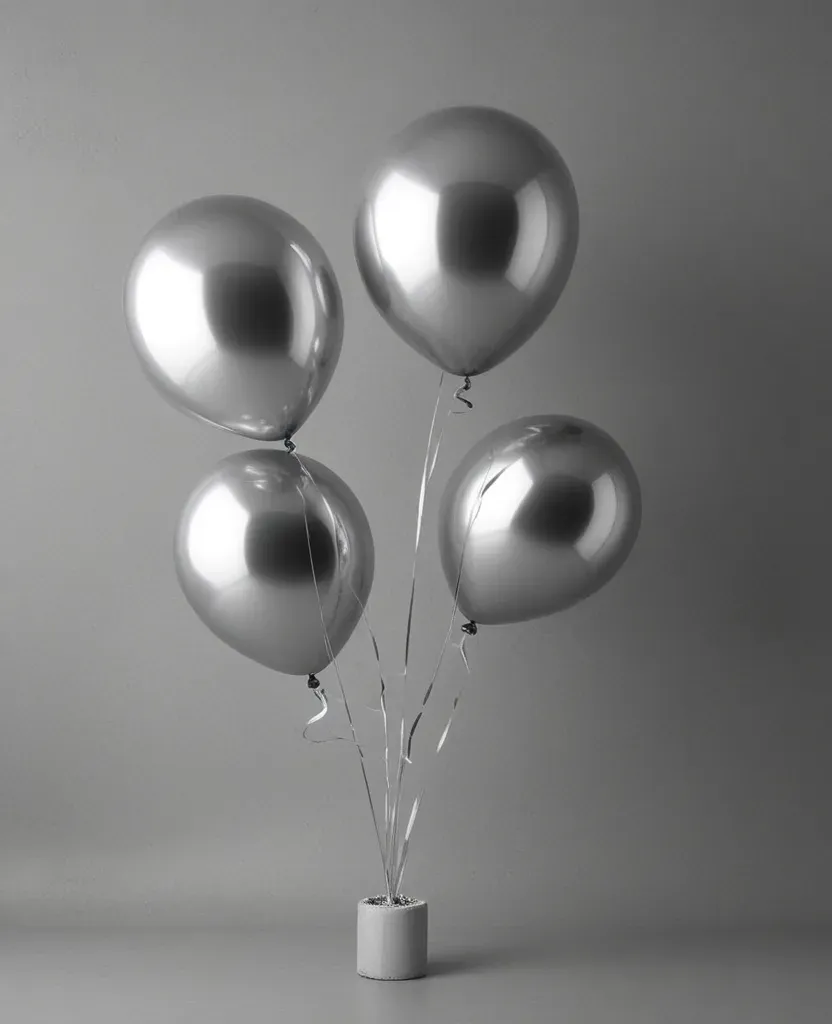 Four glossy, reflective metallic silver balloons clustered in the center against a minimalist gray background, softly lit from above, creating gentle shadows and emphasizing their smooth texture. The composition is balanced with ample copy space, ideal for product or event imagery.