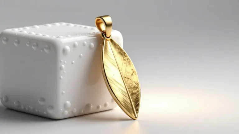 A golden leaf pendant hangs elegantly from a textured white cube, highlighted by soft, diffused lighting that accentuates the glossy surface of the pendant and the dimpled texture of the cube. The light gray background provides a clean, minimalistic setting that emphasizes the subject.