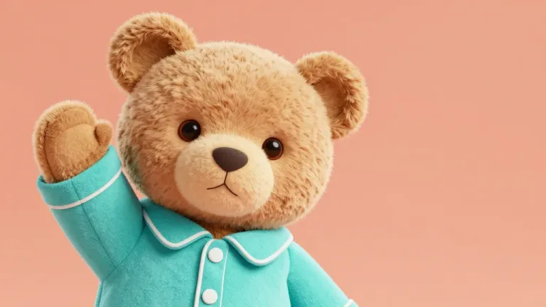 A plush teddy bear in turquoise pajamas nestles comfortably, with soft, diffused lighting creating gentle shadows. The shallow depth of field and solid peach background provide a clean, focused composition ideal for product or children's content.
