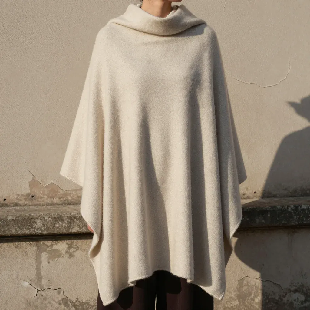 A person wears a cream-colored poncho draped over their shoulders, bathed in warm golden sunlight that highlights the soft texture of the fabric and creates soft shadows on the textured wall behind. The balanced framing and slightly blurred background emphasize the subject while providing a sense of depth and atmosphere.