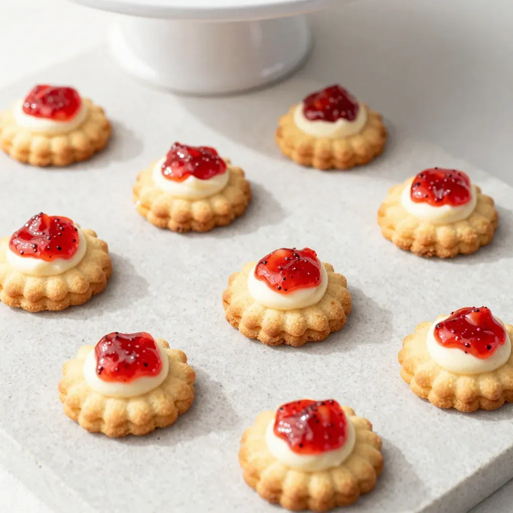 Golden biscuits scattered with glossy red jam and creamy white filling, softly lit to highlight textures. The light surface and blurred background create a casual, inviting arrangement with ample copy space.