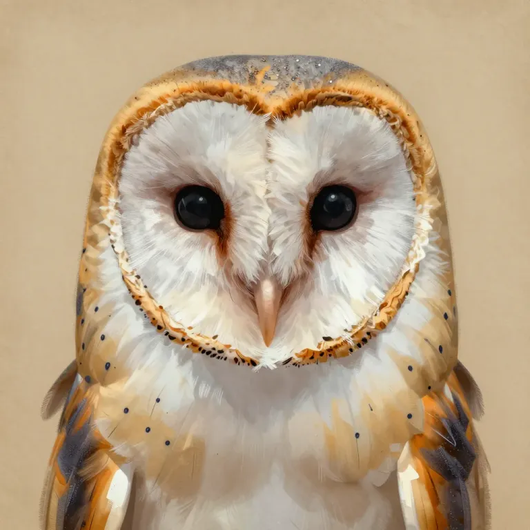 A close-up of a barn owl's front view, showcasing its intricate white and orange plumage with glossy sheen and black speckles, illuminated by soft ambient light that highlights the texture. The warm, neutral beige background is blurred to emphasize the owl's detailed features and create a shallow depth of field.